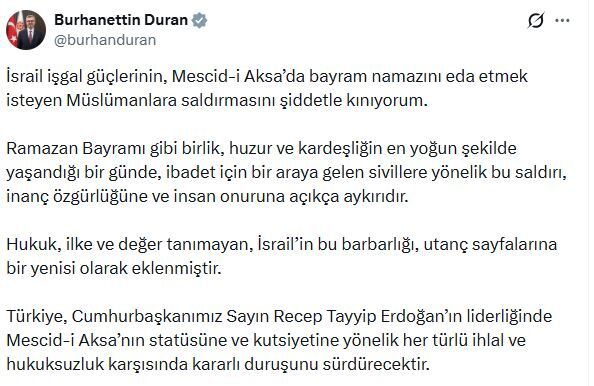İletişim Başkanı Burhanettin Duran, “İsrail işgal güçlerinin, Mescid-i Aksa’da bayram namazını eda etmek isteyen Müslümanlara saldırmasını şiddetle kınıyorum” dedi.